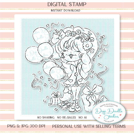 Mindy is an original birthday/celebration inspired illustration created for cardmaking, scrapbooking, paper crafting, and coloring!