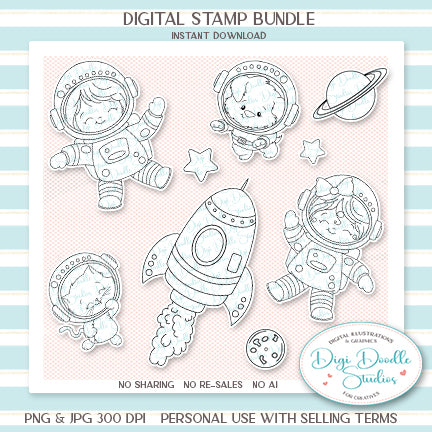 "Space Odyssey Digi Bundle"! Who doesn't love a cute and joyful Astronauts?!! These sweet images can be used all year round for many different occasions or Just Because. Our Space Odyssey Digi Stamp Bundle makes a wonderful edition to our Everyday Collections.
