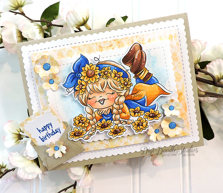 This is "Sunflower Dreams"! Who doesn't love Fall?! This sweet image a reminder of cooler temps, pumpkins, hayrides and Fall festivals. Our Sunflower Dreams Digi Stamp makes a wonderful edition to our Autumn Collections.